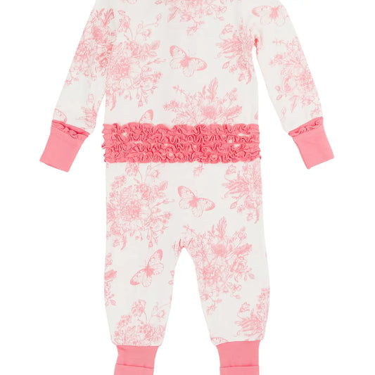 Baby Girls Pink Butterfly Garden Toile Bamboo Viscose Convertible Ruffle One Piece Pajama