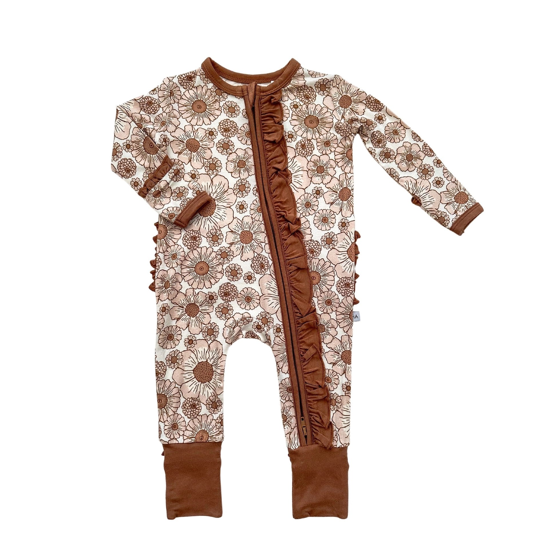 This Flower Garden bamboo ruffle outfit makes the perfect going home outfit or gift. Made from naturally soft and lightweight bamboo viscose material to keep your baby comfortable. A one-piece outfit that features a 2-way zipper that runs from the neck to the ankle making those diaper changes super easy! Fold over hand and feet cuffs to keep baby from scratching and to keep their little hands and feet warm.